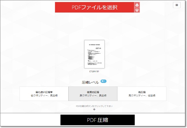 アップロード&圧縮が終わったら、お好みの圧縮率を選んで、「PDF圧縮」をクリック。