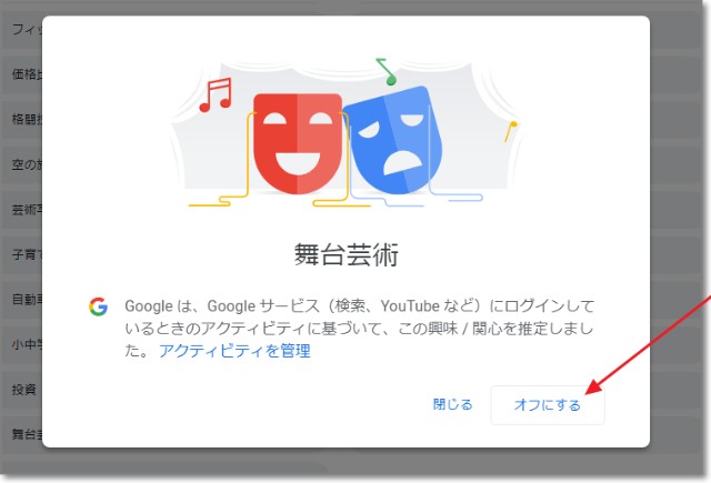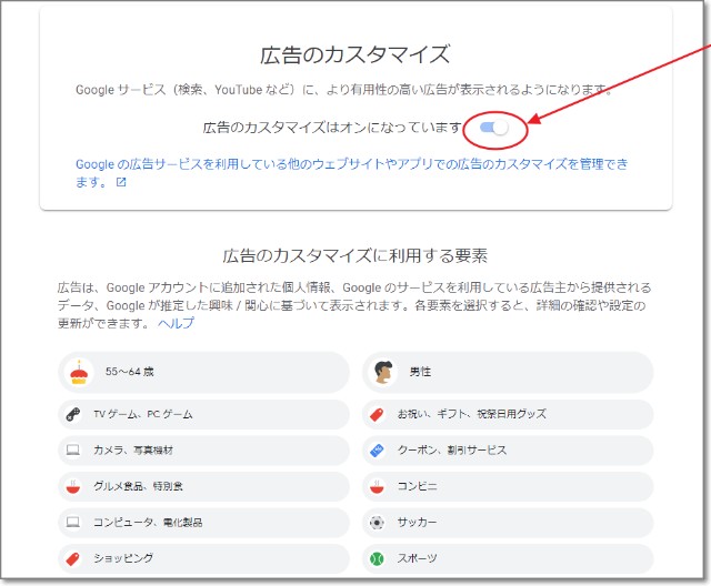 「広告のカスタマイズは~」がオンになっていたら、クリックしてオフにします。