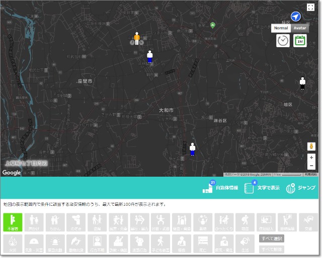 たとえば、「過去1ヶ月間の不審者情報」をアバターで表示してみると・・・