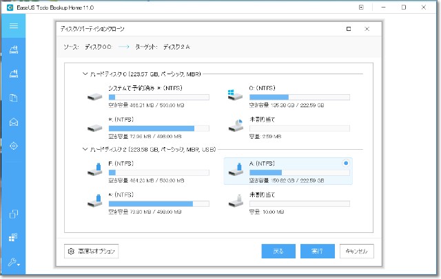 「ターゲット」に、Aドライブ(SSD)を選んで、「実行」。