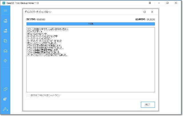 1時間34分で、240GBのシステムドライブ(SSD)のクローンができました。