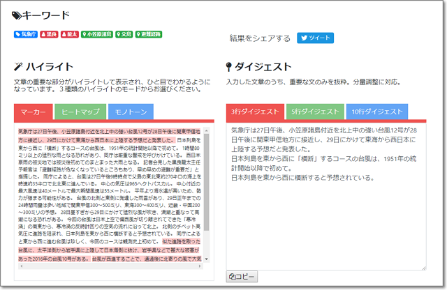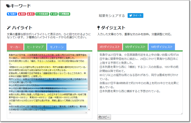 […] シンプルですが、意外と実用的です。 (3)で紹介した「User Local 自動要約ツール」と同様に、 要約文の「重み」によって、文字色の濃さが変わっています。 […]