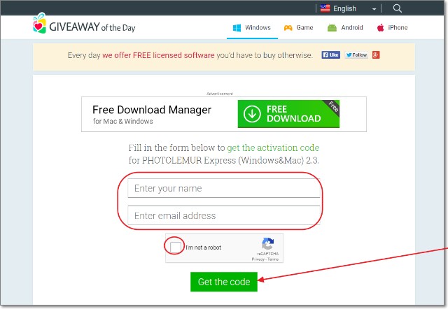 名前・メールアドレスを入力、「I’m not a robot」にチェックして、「Get the code」。