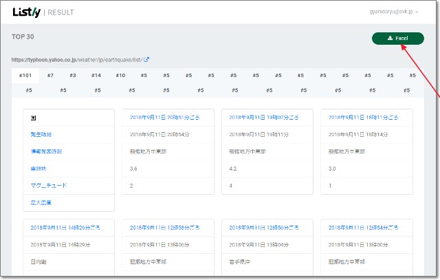 ためしに、Yahoo!の地震情報リストを、エクセル化してみます。