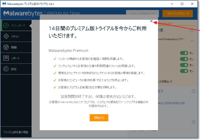 購入を検討している場合は「開始する」、無料版での利用を続ける場合は「×」。