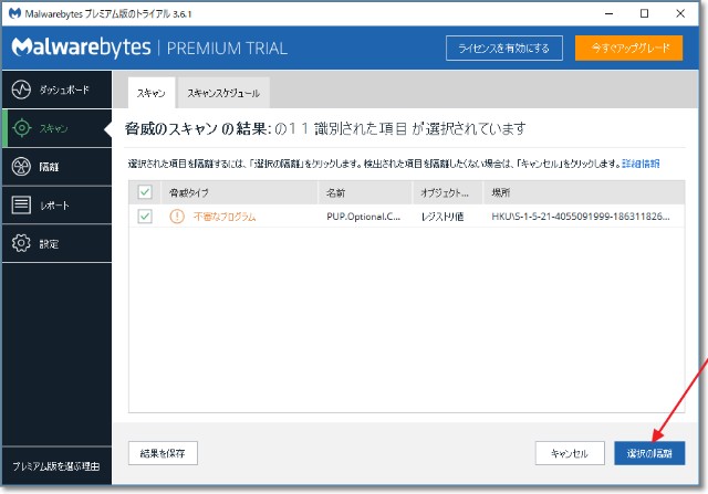 怪しげなものがあるときは、確認して、必要に応じて「選択の隔離」。