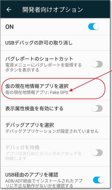 「仮の現在地情報アプリを選択」をタップして、「Fake GPS」を登録します。