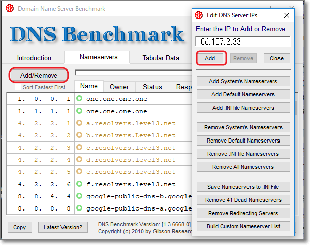 「Add/Remove」で、先ほどのDNSサーバーのアドレスを入れ、「Add」。