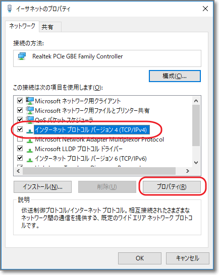 「インターネットプロトコル バージョン4」を選んで、「プロパティ」。