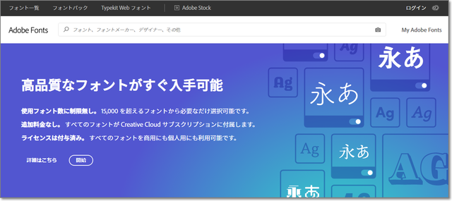 Adobe Fontsサイトの右上「ログイン」から、ログインします。
