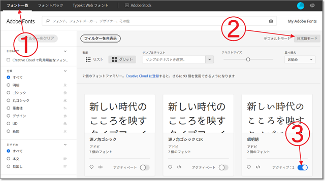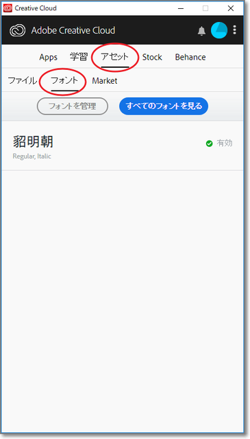 「Creative Cloud」を起動して、「アセット」→「フォント」を選択。