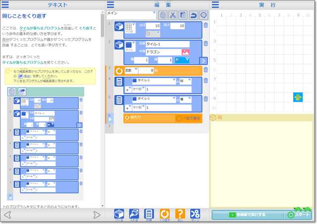 左がテキスト、中央がプログラムそのもの、右が実行画面。