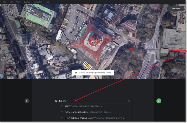 上部で、Google Earthと同じ操作方法で目的場所をアップしてもいいし、