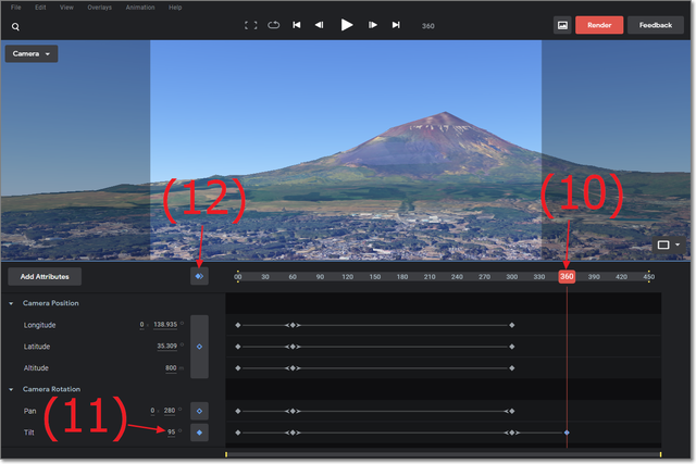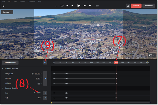 (8)Panを「280°」ぐらいに設定すると、たぶん富士山が見えます。