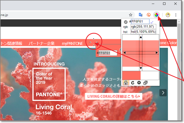 カラーコードを取得したいところでクリックすると、16進数が表示されます。