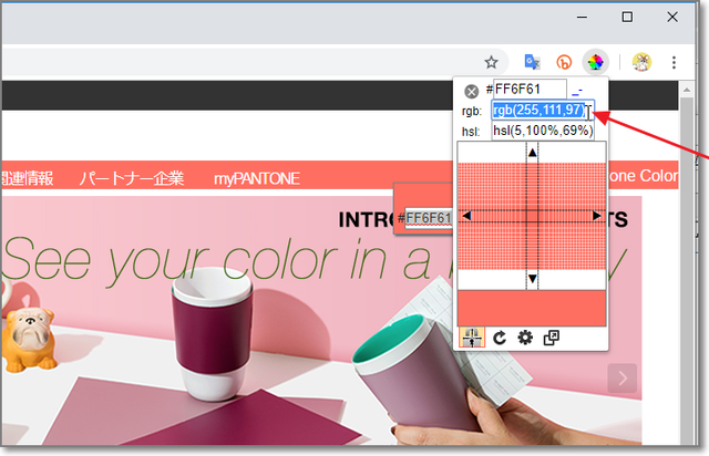 もう一度アイコンをクリックすると、16進数・RGB・HSLが表示されるので、