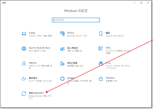 Windows10だったら、「スタート」→「設定」→「更新とセキュリティ」・・・