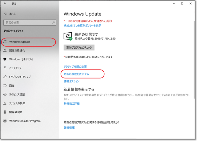 ウィンドウが開いたら、「更新の履歴を表示する」をクリック。
