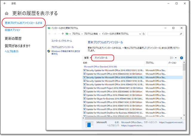 「更新プログラムをアンインストールする」をクリックすると、一覧が表示されます。