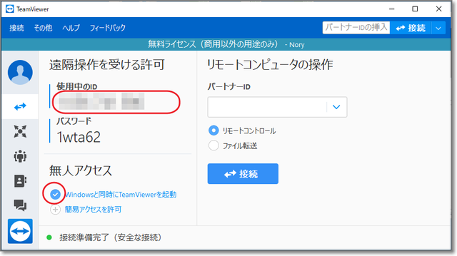 これで、外部のTeamViewerから、上記ID&パスワードでアクセス。