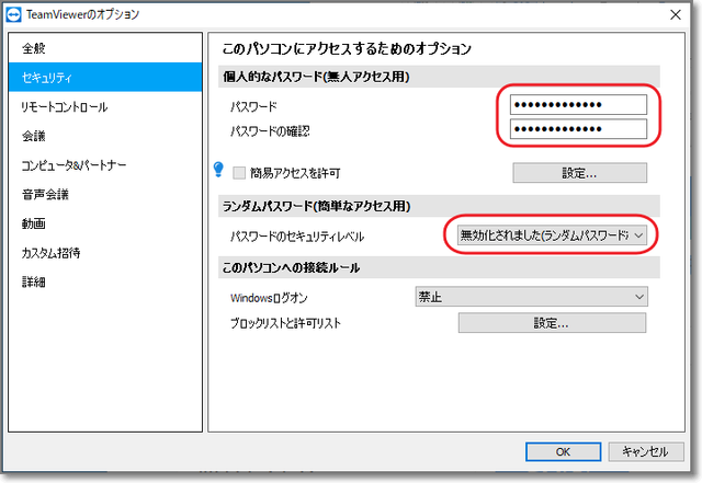 「ランダムパスワード」は6桁で危ないので、「無効化されました」を選択。