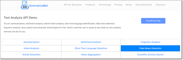 「SummarizeBot」は、文章要約や偽ニュース判定などのサービス・デモ。