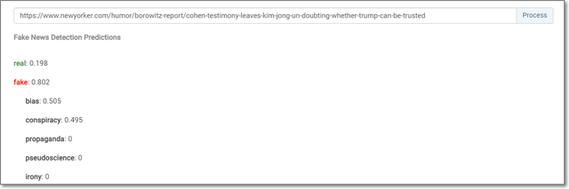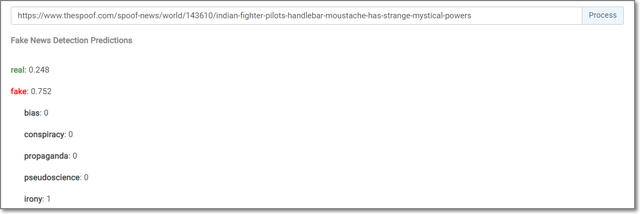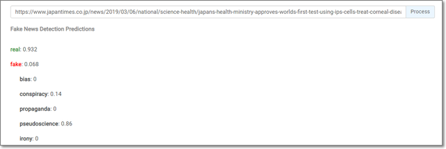 偽ニュース判定は、本当(real)かウソ(fake)かを確率で示して、