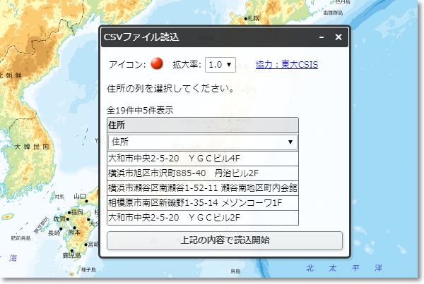 「CSVファイルをドラッグ&ドロップして、複数住所地を地図に表示する」