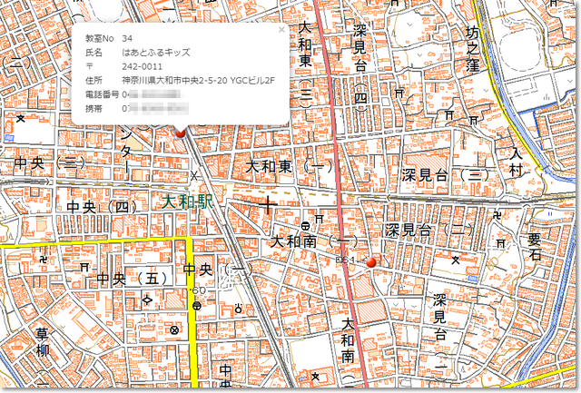 ピンをクリックすると、CSVに書かれていた情報が出ます。
