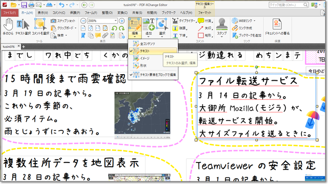 「編集」→「テキスト」で、埋め込まれている文字を書き換えたり、フォントを変えたり。