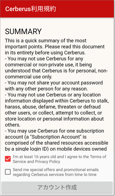 「16歳以上で~」と書いてあるところにチェックして、「アカウント作成」。