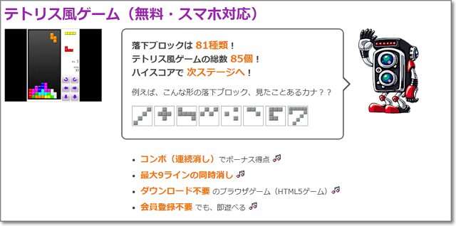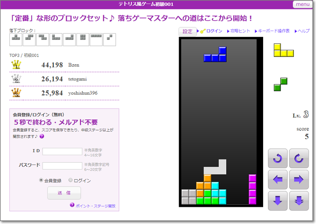 テトリス風ゲーム集 パソコン X Facebook LINE コピー 2019.06.04 レベル別のテトリスが、85個用意されたサイト。 「テトリス風ゲーム」 初級→中級→上級→達人→神 の5ステージがあります。 初級には28個のゲームがあり、ポイントを貯めることで中級以上に進めます。 テトリスは苦手だけど・・・ 初級001なら、なんとかついていけそう。 初級でも、先に進むと、ややこしいブロックが出てきます。 test ad