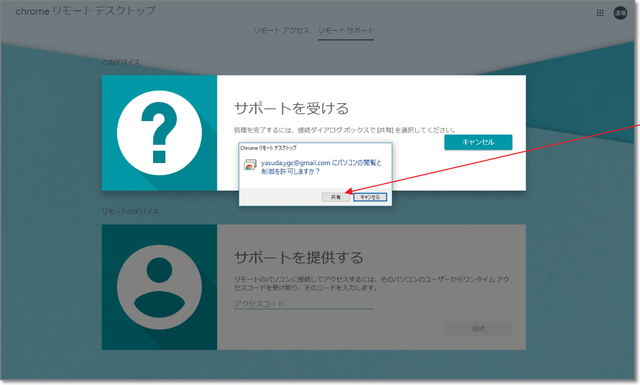 3.サーバー側で、アクセスの確認が出るので、「共有」。