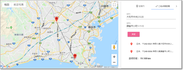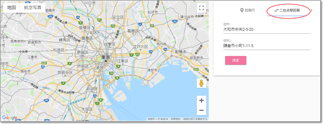 住所を入力して、「決定」をクリックすると・・・