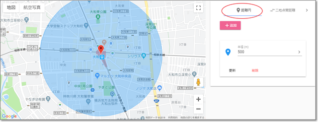 中心地から半径○m圏内の円を描いたりできる、Webサービス。