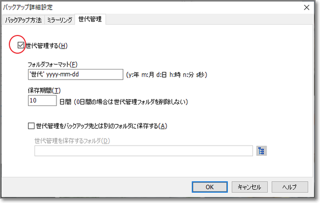 世代管理する場合は、「世代管理する」にもチェック。