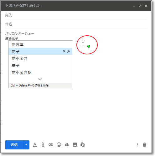 IMEをオンにすると、マウスカーソルの右下に緑丸が出ます。