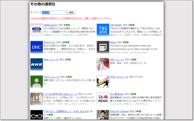 Youtubeチャンネル検索なので、「キーワード」にはニュース関連以外も入れられます。