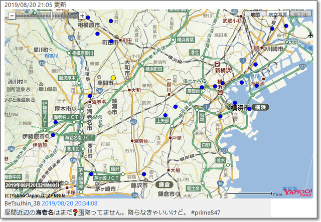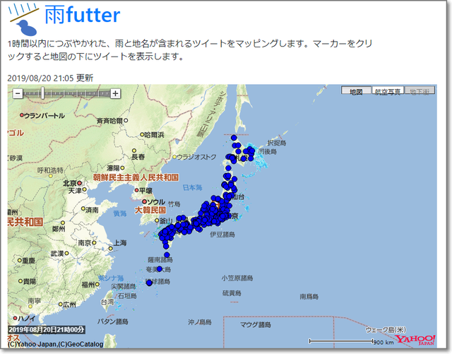 雨ツイートを地図配置 パソコン X Facebook LINE コピー 2019.08.20 1時間以内の雨ツイートを地図上に配置して、雨模様を見るサービス。 「雨futter」 ツイッターで、「雨」と地名の含まれるツイートを分析してマッピング。 「いま大和駅、雨は降りそうもない」 「三浦さんとゴルフに行くと、いつも雨にたたられる」 なども含まれるため、その場所で雨が降っているとはかぎりません。 地図をふつうに移動・拡大縮小。 なんとなく、雰囲気・傾向を見ます。 青丸をクリックすると黄色くなって、下にツイートが表示されます。 test ad
