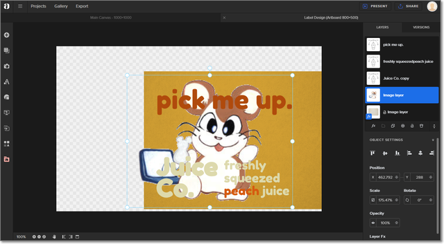 ラベル編集キャンバスが出て、文字を編集したり、画像を足したり。