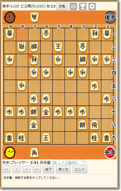 「ぴよ将棋w」正式版 パソコン X Facebook LINE コピー 2019.09.04 以前紹介した「ぴよ将棋」ですが、 Web版「ぴよ将棋w」が正式版になりました。 スマホでもパソコンでも、楽しめます。 初心者からアマチュア3段まで、30レベルのコンピュータと対戦できます。 今日は強気に、初段のピヨ馬と対戦。 序盤で、もうかなり不利になってしまいました(/_;) 「ヒント」を見ながら反省すると、勉強になります。 test ad