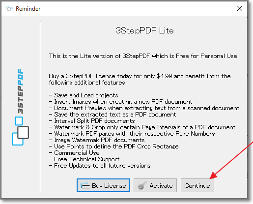 無料版を起動したとき、ライセンス購入を勧めてきます。