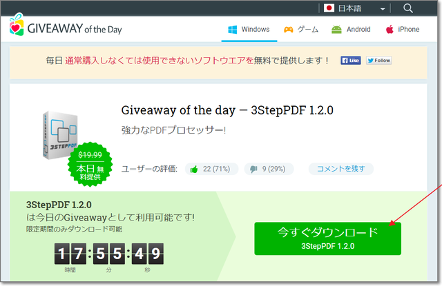 Giveaway of the Dayのページで、有料版ライセンスが無料で入手できます。