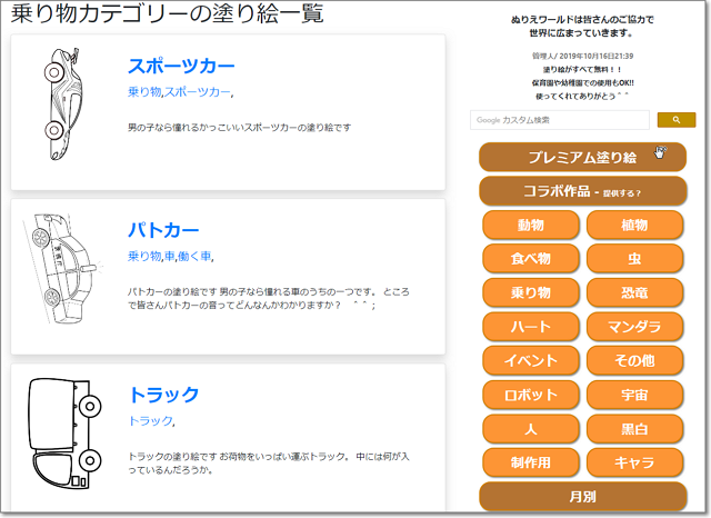 塗り絵サイト パソコン X Facebook LINE コピー 2019.10.17 塗り絵をダウンロードできるサイト。 「ぬりえワールド」 子どもからおとなまで、塗り絵を楽しみたいときに。 個人利用だけでなく、保育園など施設利用もOK。 右カラムに、カテゴリがあります。 好きな塗絵を選び、次のいずれかをダウンロード。 ・A4サイズ全面 ・A5サイズ(A4用紙に2枚印刷) ・A6サイズ(A4用紙に4枚印刷 test ad