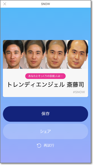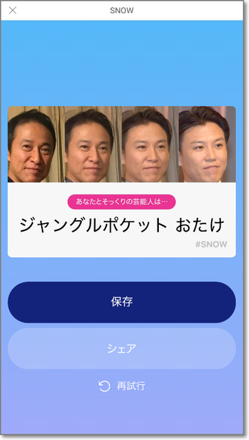 SNOWの「そっくり診断」 パソコン X Facebook LINE コピー 2019.11.08 定番アプリ「SNOW」の「そっくり診断」が話題なので、 遊んでみました。 起動すると、紫色のボタンが表示されるので、タップ。 「スタート」で、写真を選ぶだけ。 カメラで撮影せず、ストレージの写真を選ぶ形です。 こんな結果になりました。 似ているような・・・、ビミョーな結果。 今度は、30年前の写真で。 うーん (-.-;) あまり愉快ではないアプリだ。 test ad
