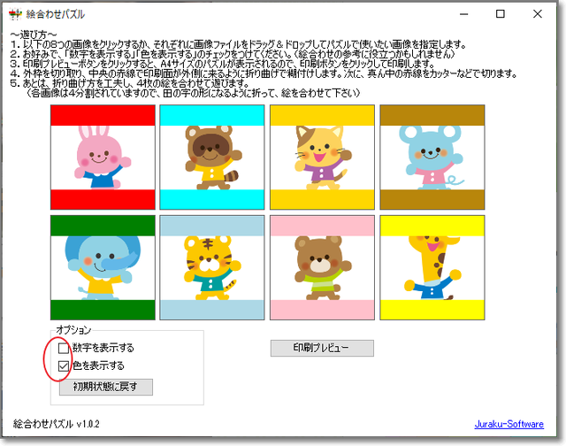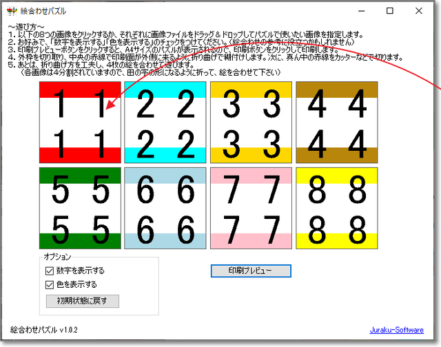 8枚の画像ファイルから、絵合わせパズルが作れるソフト。