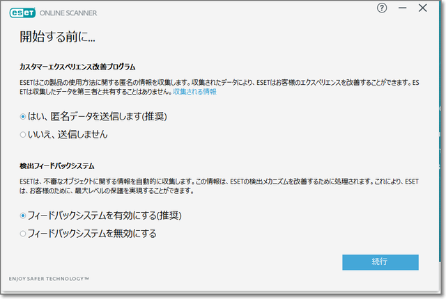 フィードバック等はお好みで選んで(できれば推奨のほうで)、「続行」。