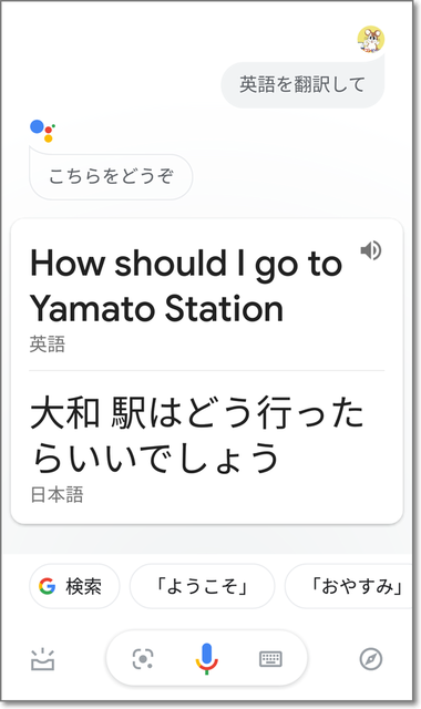 日本語で「大和駅はどこですか?」というと、英語に翻訳してくれました。