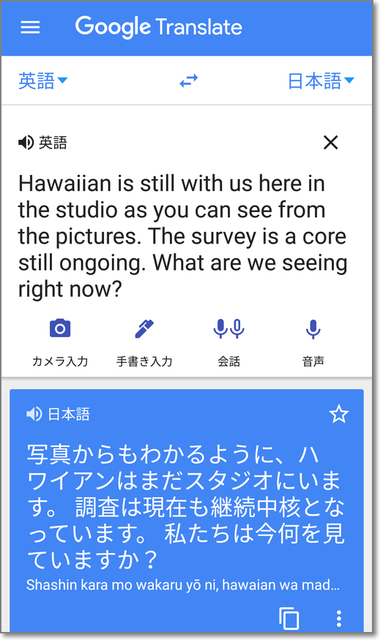 スマホに向かって、「オーケー グーグル、英語を翻訳して」というと、