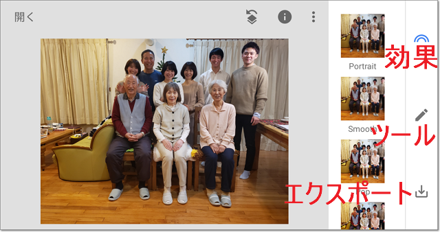 ・効果=「ポップ」など、写真にエフェクトをかけます。